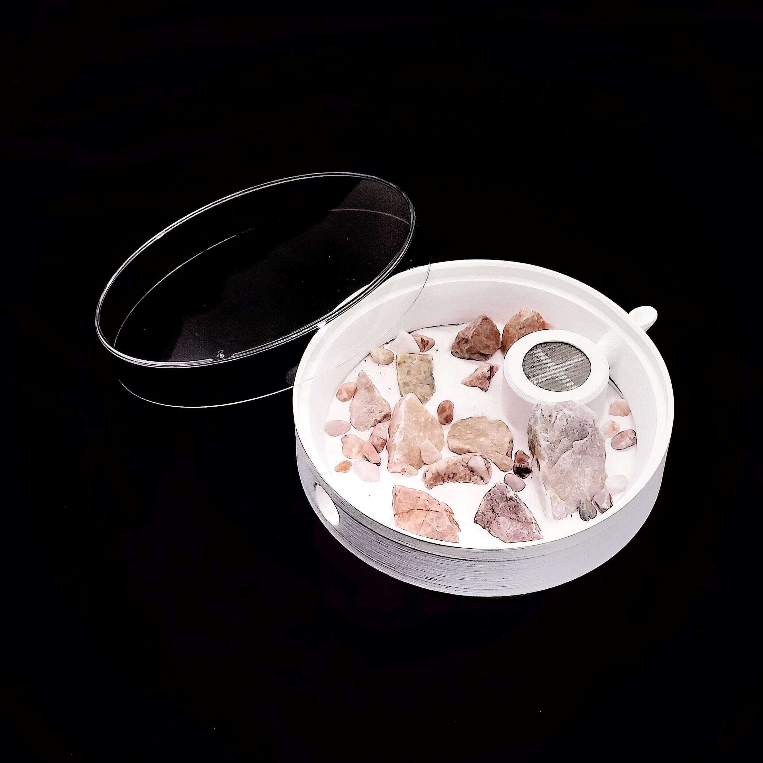 発送容器の天然石入り平型石膏巣|ラウンドタイプを巣として飼育が可能です。